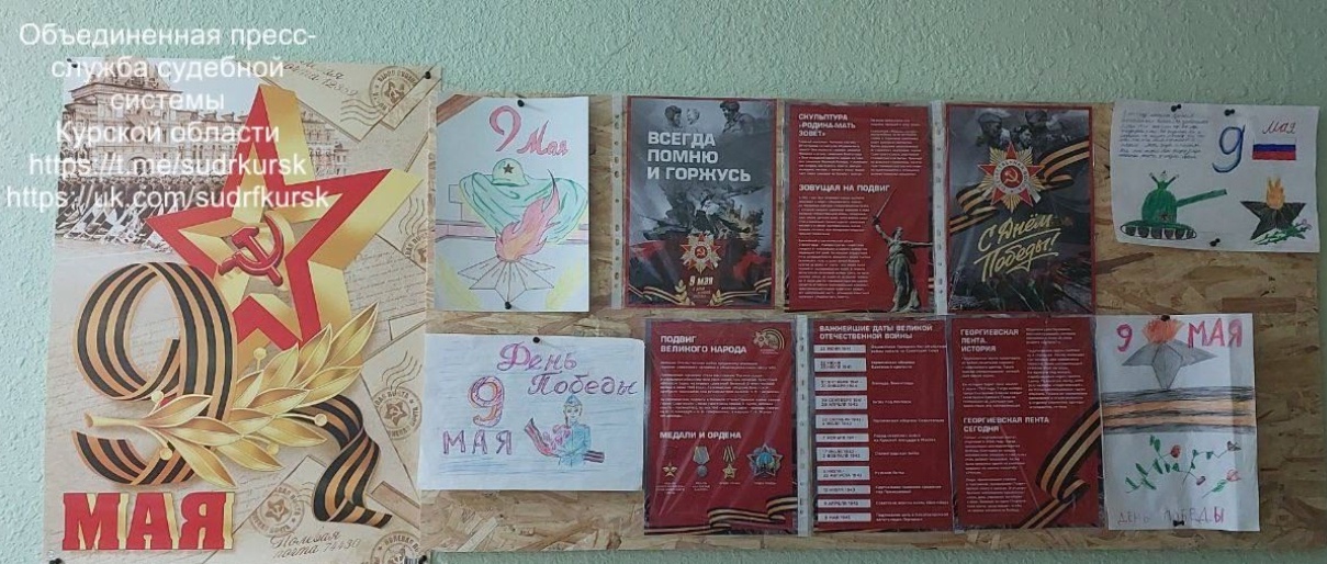 ![]() В преддверии 80-й годовщины Победы в Великой Отечественной войне сотрудники Большесолдатского районного суда оформили стенд, на котором разместили рисунки своих детей и тематические плакаты И стар и млад знает, что праздник 9 Мая – это не просто праздник, а один из великих дней, почитаемый не только в России, но и во многих других пострадавших от фашистских захватчиков странах. День Победы - праздник важный для каждого человека. Невозможно найти семью, которую не коснулась эта страшная война, унесшая жизни миллионов солдат и мирных граждан. |